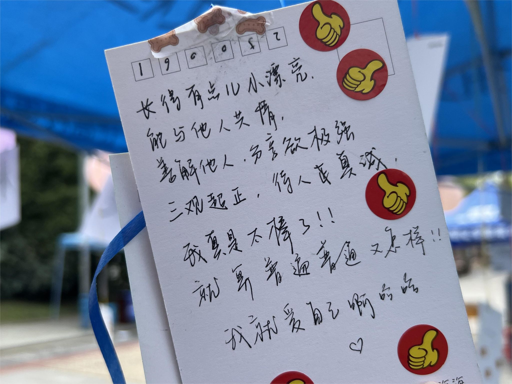 活动主要由匿名夸夸我、心情交换盲盒两个互动游戏组成。在“匿名夸夸我”游戏中,同学们在明信片上匿名写下夸奖自己、鼓励自己的话,同时,若感受到他人的话激励了自己,则可以在该明信片上“点赞”。在“心情交换盲盒”游戏中,同学们在便签纸上写下自己的烦恼,放入“坏心情”盲盒中,丢掉坏心情,随后再从“好心情”盲盒中抽取一张写有鼓励的便签,获得好心情。现场参与活动的同学表示“活动十分有趣,通过这些游戏,我希望能把自己的快乐和正能量分享给其他同学,希望大家每天都能保持心情愉悦,斗志满满地投入学习中去!”